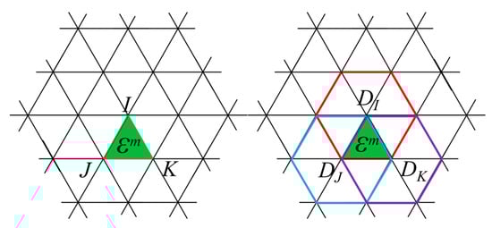 For the OFEM, the triangular domain is the overlap region of the local domains DI, DJ, and DK. Im is the set of nodes which are the intersection of the local domain DI and the overlap region . The global approximation in the present OFEM scheme is constructed as [46]