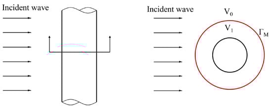 The acoustic scattering by an infinite rigid cylinder with radius a = 0.2 m is studied in this section. As shown in Figure 4, the incident wave is a unit plane wave and the direction of the wave is along the x-axis direction. Since variables are unchanged along the z-axis direction, this problem can be reduced to a two-dimensional problem. The DtN boundary is a circle centered at the origin with radius Ra = 1.2 m. Then, the acoustic scattering pressures can be sought by solving the following acoustic problem