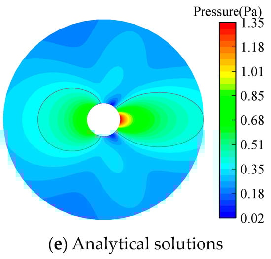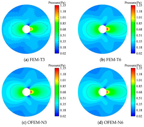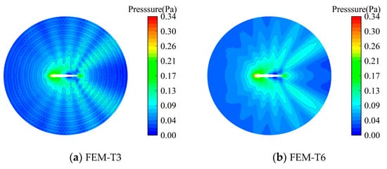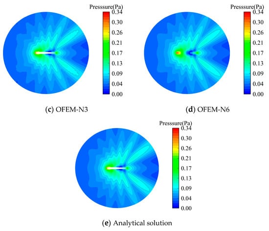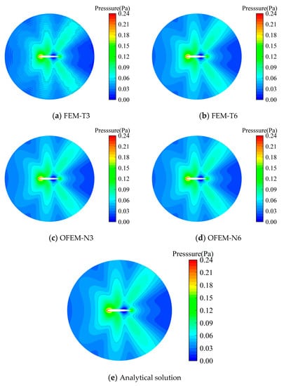 The contour maps of acoustic pressure obtained from numerical methods and analytical solutions for k = 10 are displayed in Figure 6. It can be observed that the FEM-T3 yields almost meaningless results as apparent oscillations can be observed. In addition, by comparing the wavefront on which the acoustic pressure is 0.5 Pa, it is noted that the FEM-T6 and the OFEM-N3 can yield very similar solutions. Moreover, the numerical waves generated by these two schemes travel faster than the exact waves. This is because the numerical model of the two schemes has an over-stiff behavior [61,62], leading to a smaller numerical wavenumber than the exact wavenumber. By contrast, the OFEM-N6 model, with the close-to-exact stiffness of the exterior acoustic scattering systems, can provide the most precise solutions among all numerical methods.