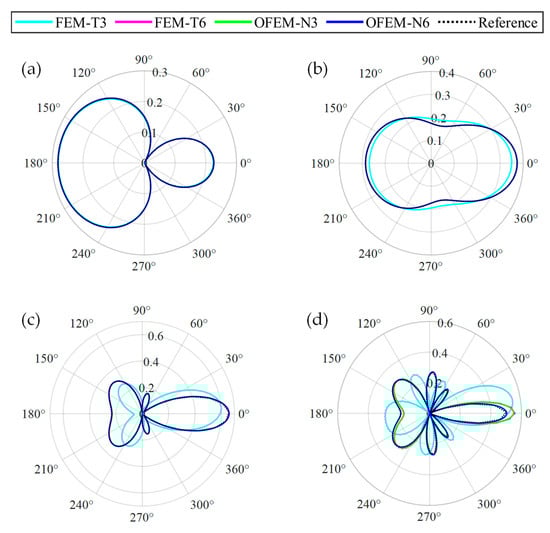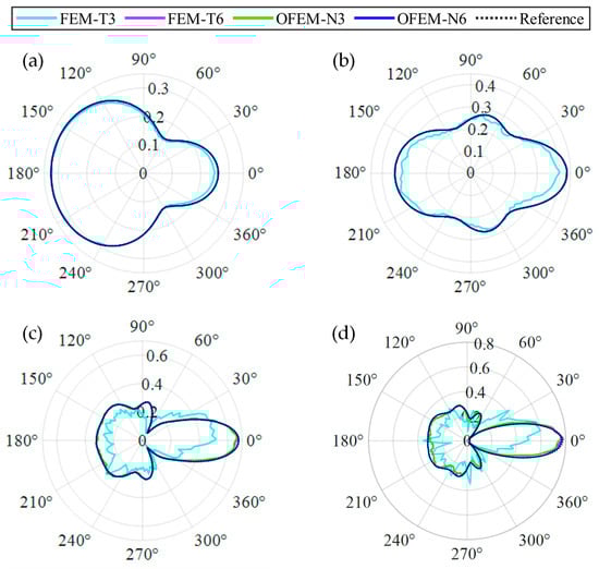 Then, the real part of the scattering pressure at r = 1 m away from the center (the directivity patterns) for different wavenumbers is given in Figure 7 for detailed comparison. A similar conclusion can still be reached according to Figure 7. The solutions obtained from all of the numerical methods are consistent with the analytical results for the wavenumber k = 5, indicating that all of the numerical methods can achieve high accuracy at relatively low frequency. However, the solutions obtained from FEM-T3 are different from the analytical solutions for k = 10, 20, and 30. The curves of FEM-T6 and OFEM-N3 coincide with analytical solutions for wavenumbers k = 10 and k = 20, whereas apparent deviations can be noted between FEM-T6, OFEM-N3, and the analytical solution for wavenumber k = 30. By contrast, only OFEM-N6 can reach a high accuracy at the relatively high frequency.