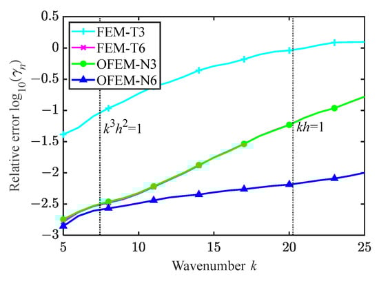 Figure 8 illustrates the relationship between the relative error and the wavenumber. It can be observed that the relative error of all of the numerical methods rises with increasing wavenumber in the acoustic scattering problems. The FEM-T6 behaves in a similar way to the OFEM-N3 and can provide a reasonable solution accuracy for non-dimensional wavenumber kh < 1. In addition, the relative error in OFEM-N6 increases slowly and is less than 1% for all computed wavenumbers. Note that the overlapping elements can be applied to the finite element model without changing the mesh topology. This means that the p-adaptive analysis can be easily achieved and the available computational frequency range of the original numerical model can be enlarged flexibly.