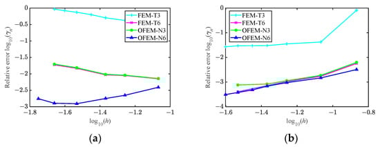 In this section, the performance of OFEM in handling underwater acoustic scattering problems is investigated by several typical numerical examples. When the complete polynomials of the first and second order are used in the local basis functions in Equation (2), these schemes are termed as the OFEM-N3 and the OFEM-N6, respectively. In addition, the numerical results obtained by the traditional finite element discretization using the linear and the quadratic triangular elements are also given for comparison, and these schemes are termed the FEM-T3 and FEM-T6, respectively. The surrounding medium is water. The density is ρ = 1000 kg/m3 and the wave speed in water is c = 1500 m/s.