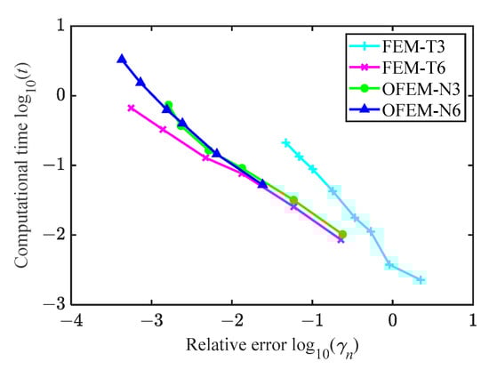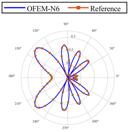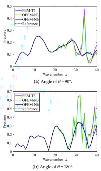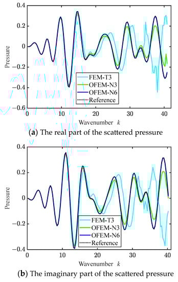Figure 20 illustrates the acoustic scattering pressure versus the wavenumber k with different numerical methods. According to the results of the previous example, the performance of the proposed OFEM-N3 is similar to that of the classic quadratic triangular finite element. Thus, the solutions of the conventional FEM-T6 are not plotted in Figure 20. It can be found that all solutions obtained from numerical methods are exact in the low frequency range. However, in the higher frequency range, there is a deviation between the solutions obtained from the FEM and the reference solutions, while the OFEM-N6 solutions are consistent with the reference solutions.