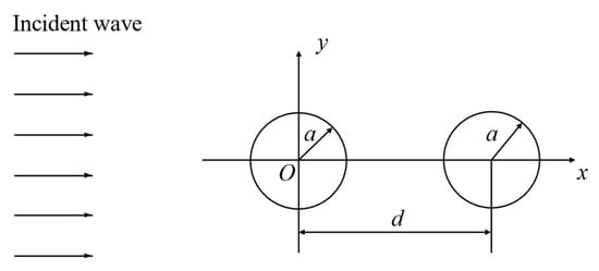 The multi-object acoustic scattering problem is examined in the frequency domain to illustrate the performance of the OFEM in this section. As shown in Figure 19, the multi-object system consists of two cylinders with radii of a = 0.2 m. The centers of the cylinders are located at the origin and (0.4, 0), respectively. The cylinders are surrounded by water with a density of 1000 kg/m3. The infinite domain is truncated by an artificial boundary, which is a circle centered at the origin with a radius of 1.2 m. The incident wave travels in the x-axis direction with a speed of c = 1500 m/s. The observation points are located on a circle centered at the origin with a radius of 1 m in different directions. Since the system is complex and it is difficult to derive a theoretical solution, a reference solution is obtained from a high-order finite element analysis with a refined mesh.