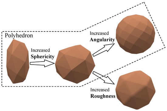 Unlike ideal spherical particles, soil particles in nature exhibit more complex geometrical characteristics and entry conditions (e.g., original orientation), and using particles with more irregular shape in the simulation can reflect a more realistic free-settling process. In view of this, Chen et al. [39] investigated the flow characteristics and clogging mechanism of irregularly shaped particles in hydraulic conveying pipelines. Ma et al. [36] introduced several examples about the application of the non-spherical particles in the resolved CFD-DEM simulations of solid–fluid systems and various particle models such as the multi-sphere model [40] and polyhedral model [41]. Additionally, the polyhedral granular material is characterized by three main shape parameters [42,43]: roughness, angularity, and sphericity, as illustrated in Figure 1. The difference between irregular and spherical particles significantly affects the dynamic properties of fluid–solid interaction. To the best of the authors’ knowledge, far too little attention has been paid to the effect of these shape characteristics and the original orientation of particles on the kinematics behaviors and fluid during the free-settling process.