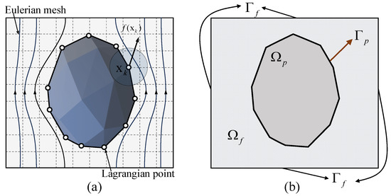 where and p represent the velocity and pressure of fluid, respectively. The is the fluid density and denotes its viscosity. is the particle boundary and denotes the surrounding domain occupied by fluid. In the forcing method used in this study, the immersed boundaries can be described as a series of material Lagrangian points with positions . The cumulative external force exerted on these points arises from both hydrodynamic interactions and boundary deformation [49], and it can effectively spread to the adjacent fluid meshes, completing the interaction between the particle boundary and fluid domain. The spreading process is approached by employing a Dirichlet function to disperse the total boundary forces across the fluid domain based on their respective distances between the Lagrangian boundary point and the Eulerian fluent point