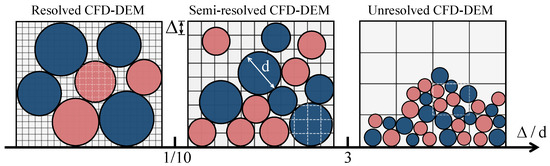 Illustration of the simulation gap between resolved, semi-resolved, and unresolved CFD–DEM approaches.