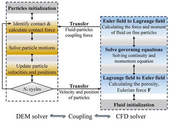 The CFD-DEM coupling process starts by initializing the particle data, and then contact forces of the particle assemble are calculated to update the velocities and positions of the particle (Figure 4). Once the calculation of intervals are complete, the Lagrangian fields of particles, such as positions and velocities, are transferred into the Eulerians domain. Furthermore, the forcing term F is obtained from the force density on the Lagrangian point in the particle boundaries and incorporated into the following solution of the fluid motion, namely, the NS equations. Subsequently, these coupling forces are calculated based on the pressure and velocity of the fluid and transmitted to the DEM solver, which are then employed in the ensuing cycle.