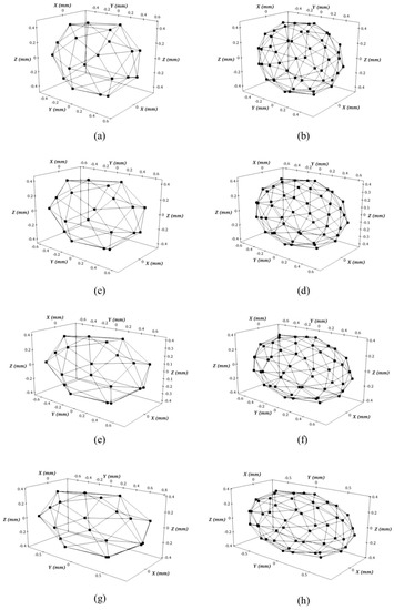 Diagrams of particle shapes employed in simulations, equivalent sphere diameter d = 1 mm: (a) AR = 1.25, C = 20; (b) AR = 1.25, C = 50; (c) AR = 1.5, C = 20; (d) AR = 1.5, C = 50; (e) AR = 1.75, C = 20; (f) AR = 1.75, C = 50; (g) AR = 2.0, C = 20; (h) AR = 2.0, C = 50.