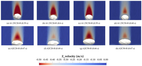 Furthermore, as particles continuously descend, their velocities and the fluid wake region velocity remain stable. When particles approach the bottom boundary, variations in the fluid velocity field start to emerge in its vicinity. The presence of the bottom boundary alters the fluid velocity patterns, giving rise to a gradient in the fluid velocity field, as depicted in Figure 14. Substantial changes in the fluid velocity field arise upon particle collisions with the bottom boundary, resulting in rapid variations in fluid velocity and the formation of vortices. These interactions subject the particles to a reactive force from the bottom boundary, leading to deceleration. Additionally, these representative snapshots of the velocity fields demonstrate the influence of particle shape, particularly as the particle’s AR value increases. Larger surface contact with the fluid occurs beneath the particles, leading to elevated resistance. Resolved CFD-DEM effectively captures the intricate boundaries of the polyhedral particles.