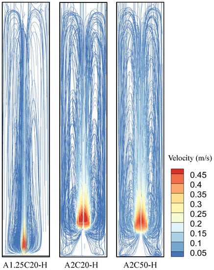The velocity contours and streamlines of the fluids in three cases (A1.25C20-H, A2C20-H, A2C50-H) at the time of 0.6s are presented in Figure 15. Notably, it can be observed that the fluid surrounding the particles exhibits higher velocity, while the fluid situated above the particles experiences deceleration as the height increases. It is evident that the fluid velocities differ across each case. For instance, for A2C20-H, the particle exhibits a slower velocity, yet its associated fluid velocity is relatively higher. This observation is attributed to the larger reaction force exerted by the particle on the fluid. Additionally, the velocity distribution of the fluid displays greater symmetry within its domain, with vortices being observed solely around the particles [5].