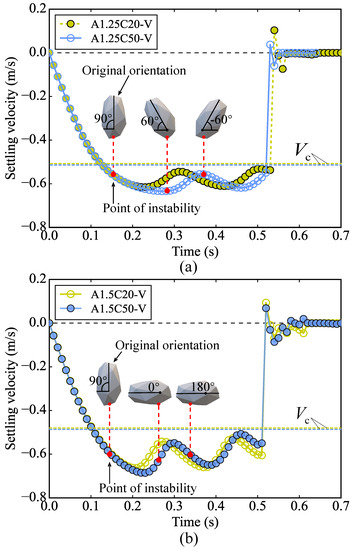 Evolution of settling velocity of polyhedral particles with different C value: (a) C = 20; (b) C = 50.