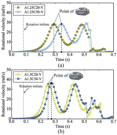 Evolution of rotational velocity of polyhedral particles with: (a) AR = 1.25; (b) AR = 1.5.