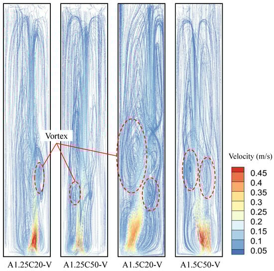 The fluid’s streamlines in the four cases (A1.25C20-V, A1.25C50-V, A1.5C20-V, A1.5C50-V) at the moment of 0.56 s are depicted in the Figure 20. Numerous vortices have congregated above the fluid, primarily due to the rotational motion of the particles. Notably, in the A1.5C20-V test scenario, the fluid experiences the highest level of disturbance, characterized by a broader array of vortices. Conversely, the A1.25C50-V test exhibits fewer and smaller vortices. This observation underscores the substantial influence of particle shape attributes (AR and C) on the entire fluid velocity domain. Specifically, a higher AR value results in a more pronounced disturbance of the fluid by the particles, as evidenced by the degree of fluid turbulence.