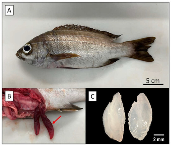 - Fehri-Bedoui, R.; Gharbi, H. Sex-ratio, reproduction and feeding habits of Pomadasys incisus (Haemulidae) in the Gulf of Tunis (Tunisia). Acta Adriatica 2008, 49, 5–19. [Google Scholar]