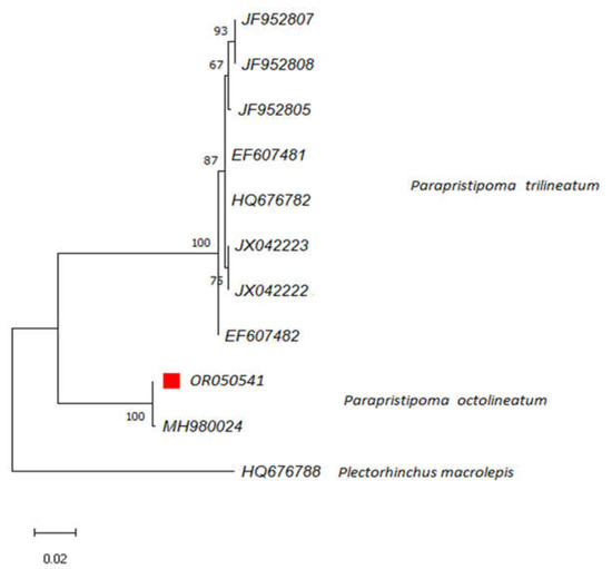 Tiralongo, F.; Pappalardo, A.M.; Ignoto, S.; Lombardo, B.M.; Ferrito, V.; Campos Sosa, A.; Spinelli, A. The African Striped Grunt, Parapristipoma octolineatum (Valenciennes, 1833), in the Mediterranean Sea: The Third Record with Biological and Ecological Notes, and Identification Key for Haemulidae Recorded in the Mediterranean. J. Mar. Sci. Eng. 2023, 11, 1688. https://doi.org/10.3390/jmse11091688