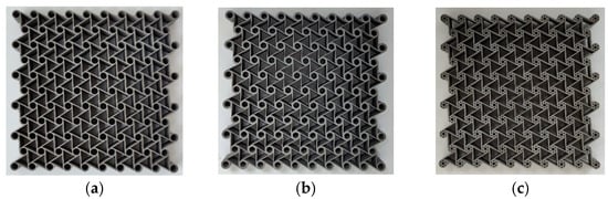 The above three honeycombs were prepared using 3D-printing technology for quasi-static compression tests with a thickness of 25 mm. The honeycomb material employed was 316L stainless steel, and its material parameters are shown in Table 1. The honeycomb specimens were fabricated using selective-laser-melting (SLM) technology, which was widely applied alongside 3D-printing technology because of the wide range of alloys and rapid fabrication enabled by this technique. During the manufacturing process, a high-power laser was used to completely melt the surface layer of the metal powder and process it layer-by-layer until the sample was completed. To avoid defects in the material structure and maximize the performance potential of the material, the specimens were surface-ground. All the fabricated specimens are shown in Figure 1, which shows their good molding quality.