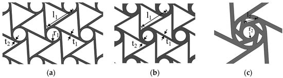 The detailed geometric parameters of the honeycombs are shown in Figure 2 and Table 2, where r1 is the node radius, r2 is the filled node radius, t1 is the ligament thickness, t2 is the node thickness, l1 is the ligament length, and l2 is the filled ligament length.