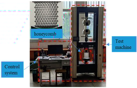 The compressor selected for the test was a WDW-300 (see Figure 3) microcomputer-controlled electronic testing machine, with a maximum test force of 300 kN and a measurement accuracy of ±5%. This testing machine is mainly composed of two parts: an operating system and a testing machine. The operating system controls the compression speed of the testing machine and stores the relevant data during a test, and the testing machine is responsible for the compression or tension at a given time. To investigate the effect of the nodal configurations on the mechanical properties of the six-ligament chiral honeycombs, constant velocity compression tests at 1 mm/min were carried out on the three honeycombs. As a result, the compressive displacement, reaction force, and deformation behavior observed during the tests were recorded.