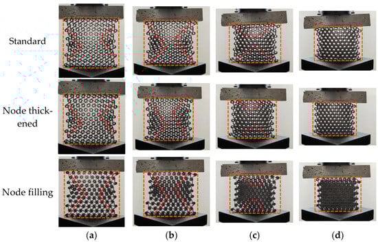 When the compression strain was 0.491, the stress of the two node configurations was higher than that of the standard honeycomb. At this stage, while the difference between these two types of honeycombs was not significant, the nodes at the top and bottom of the standard honeycomb were significantly deformed. This was due to the greater nodal stiffness of these two types of honeycomb node configurations, allowing them to resist compression. When the compression strain reached 0.589, the stress of the filled-node honeycomb was higher than that of the thickened-node honeycomb despite the deformation patterns being similar. When the compression strain reached 0.688, the stress of the filled-node honeycomb was significantly greater than that of the thickened-node honeycomb. The nodes of the node-filled honeycomb are almost invisible, while significant deformation can be observed in the nodes at the top and bottom ends of the thickened-node honeycomb. When the specimens were compressed further to a strain of 0.786, all three types of honeycombs were densified, with the filled-node honeycomb presenting the highest stress, the thickened-node honeycomb presenting the next highest stress, and the standard honeycomb presenting the lowest stress. This result indicates that node stiffness can have a significant impact on the compressive performance of cellular structures and that the deformation process varies under different reinforcement methods.