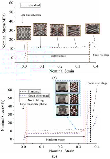 Figure 13a presents the simulated results regarding quasi-static compression for the standard honeycomb. The curve characteristics of the initial linear elasticity phase and the plateau phase are consistent with the experimental results. In the stress rise stage, the ligament is almost completely curled, and the nodes are in close contact. As the specimen is compressed further, the nodes of the upper and lower sides first undergo compression collapse; then, the overall nodes yield until they are destroyed.