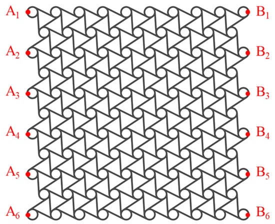 Three different configurations of six-ligament chiral honeycombs were developed: (a) standard fovea, (b) thickened node, and (c) filled node honeycombs. The standard honeycomb consists of a node connected to six ligaments in a periodic arrangement. It has 10 columns (9 columns in even rows) in the transverse direction and 11 rows in the longitudinal direction, with transverse and vertical lengths of 211.2 mm and 203.6 mm, respectively [27]. The node-thickened honeycomb was developed by thickening the nodes of a standard honeycomb, thus effectively improving the honeycomb’s overall impact resistance. The node-filled honeycomb is a standard honeycomb whose nodes are filled with small chiral cells. The six ligaments of the cell are connected to the ligaments at the nodes for transferring the load.