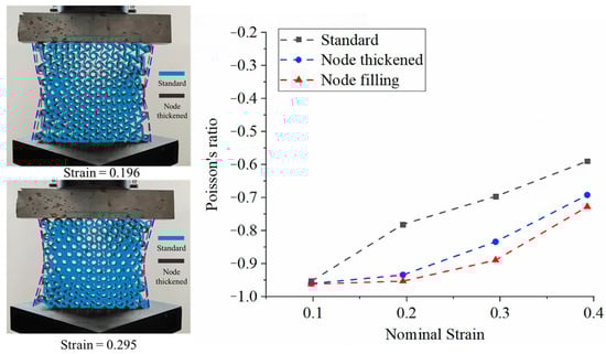Figure 7 illustrates the variation in the Poisson’s ratio values during the compression process. It can be seen that significant differences exist in the Poisson’s ratio values of the three kinds of honeycombs. Overall, the trend was the same for all three structures. Poisson’s ratio increases with increasing nominal strain. The negative Poisson’s ratio effect was more evident for filled-node honeycombs than thickened-node honeycombs and was weakest for standard honeycombs. Moreover, as shown in Figure 7, the lateral shrinkage of the thickened honeycomb under compression is significantly greater than that of the standard honeycomb (shaded in blue in the figure). It should be noted that the deformation of the filled-node honeycomb was similar to that of the thickened-node honeycomb, so only the thickened-node honeycomb was used in this section for image overlap comparison. The compression displacement of the thickened honeycomb at its nodes was completely caused by the winding deformation of the ligaments, while the compression displacement of the standard honeycomb was induced by both ligament deformation and nodal yielding, thus preserving a certain deformation margin for the ligaments, while the other two honeycombs did not undergo nodal yielding due to their nodal stiffness. The other two types of honeycombs exhibited no nodal yielding due to their increased nodal stiffness. The main reason for this phenomenon is that nodal strengthening increases the stiffness of a node and enhances the ‘rotational’ deformation mechanism; thus, an increasing negative Poisson’s ratio effect is achieved.