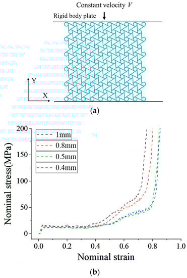 The stress–strain curves of the standard honeycomb under quasi-static compression are presented in Figure 5a, which shows three different stages, including the initial linear elasticity stage, the plateau stage, and the stress elevation stage. In the early stage of compression, the whole honeycomb exhibits linear elastic deformation. The ligaments and nodes do not deform significantly, and the stress grows linearly with the strain, which is manifested as the initial linear elasticity stage in the stress–strain curves. As compression proceeds, the ligaments on both sides yield, and plastic hinges form at the node connections, causing the nodes to rotate. They intertwine with each other and propagate this deformation behavior uniformly to neighboring cytosolic elements. In this phase, stress is kept nearly constant to form a platform, which manifests as the platform stage in the curve. A curl-winding behavior of the cellular element leads to the “necking” phenomenon, which is a typical negative Poisson’s ratio behavior. As the specimen is compressed further, the ligament is almost completely curled, and the nodes are in close contact with each other. The whole structure shows overall rigidity, for which the stress increases sharply in the curve.
