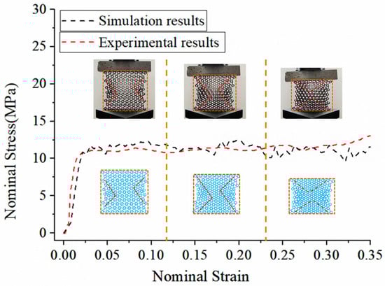 In Figure 9, the simulation stress–strain curves as well as the compression processes are compared with those of the experimental results. It can be seen that both structures show a similar double-V deformation pattern. Moreover, the stress–strain curves are also almost the same, showing good consistency. The comparison results validate the reliability of the numerical simulation method used in this study.
