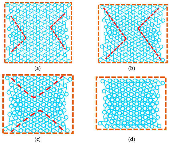 Zhu et al. [26] designed a honeycomb configuration based on the definition of a multilevel honeycomb (see Figure 15), whose main feature was that the cytokinetic elements in the nodes of the base structure were filled. The difference in the mechanical properties between the proposed structure and the base structure under quasi-static compression was investigated using numerical simulation methods. It was observed that the filling of the nodes with cytosolic elements can reduce the distortion of the nodes during the ligament-winding process, which can help to promote the “rotation” mechanism and strengthen the overall negative Poisson’s ratio effect.