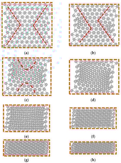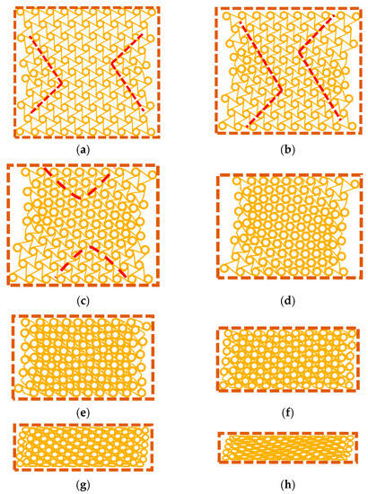 Deformation process of the standard honeycomb under different compression strains: (a) = 0.098; (b) = 0.196; (c) = 0.295; (d) = 0.393; (e) = 0.491; (f) = 0.589; (g) = 0.688; (h) = 0.786.