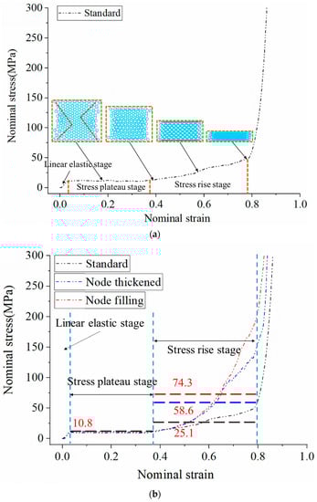 Stress–strain curves of honeycomb structures: (a) Standard honeycomb stress–strain curve; (b) stress–strain comparison.