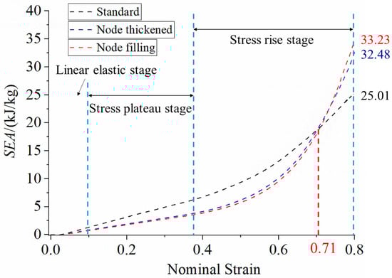 As shown in Figure 14, the specific absorption energy of the three honeycombs increases linearly during the initial linear elasticity and plateau phases, with the standard honeycomb outperforming the thickened-node and filled-node honeycombs. This is because the relative density of the standard honeycomb is less than that of the thickened-node and filled-node honeycombs and the reinforcement of the node is not involved in deformation energy absorption at this time. However, there are both localized nodal-crushing and ligament-wrapping mechanisms in the standard honeycomb and, essentially, only one ligament wrap mechanism in the thickened-node and filled-node honeycombs. The combination of the above factors leads to the fact that nodal strengthening of the honeycomb node reduces the efficiency of energy absorption in the early stage. After the first platform stage, the effect of nodal reinforcement begins to manifest itself gradually, and the differences between the two node-reinforced honeycombs and the standard honeycomb gradually decrease. Particularly, when the nominal strain is 0.71, equivalent specific energy absorption can be obtained. Afterwards, the SEA of the two nodal-reinforced honeycombs gradually exceeds that of the standard honeycomb, and the role of the node starts to become prominent. Moreover, as the nodal stiffness of the node-filled honeycomb is greater than that of the thickened-node honeycomb, the specific energy absorption of the nodal-filled honeycomb under high strain is higher than that of the thickened-node honeycomb.