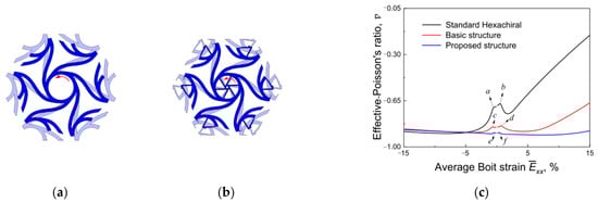 The hexachiral structure proposed by Zhu [26], and a comparison of the effects on the Poisson’s ratio. (a) Basic structure. (b) Proposed structure. (c) Effect on Poisson’s ratio under average strain for different hexachiral structures.