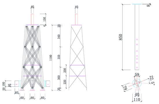 The physical model of the foundation structure is shown in Figure 1 below, and the dimensions of the physical model are shown in Figure 2. We used a model scale of 1:60, in which the diameter of the spreader bar is 18 mm, the diameter of the main bar is 32 mm, the thickness of both is 2 mm, the thickness of the pile body is 3 mm, and the thickness of the helical blade is 1 mm. The whole foundation structure consists of three parts: the conduit frame, the connecting frame, and the helical pile, in which the conduit frame mainly consists of these parts: the connecting frame is a triangular square steel tube frame at the top of the pile flange in Figure 1; the connecting frame itself is fixed to the conduit frame by bolts, and a screw is fixed on the pile body, while the pile body axis coincides with the screw axis, and the screw then passes through a hole on the frame located directly above the pile body axis. The screw then passes through a hole in the frame located directly above the axis of the pile, and is fixed to the frame by the nut on the screw, thus bearing the axial force of the pile body. The node connection details are shown in Figure 3. Figure 4 shows the number and spacing of different blades of the foundation to achieve the way, the helical blade is fixed on the connection sleeve, and the connection sleeve is connected to the pile body by screws.