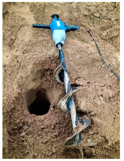The soil used in the test is Fujian standard sand, and the parameters of the soil are shown in Table 1. For the soil test, loading will produce damage in the soil body, so a steel tube for each test needs to be used for turning soil loose. For the soil body remodeling, due to the soil body being relatively large, an auger is used for the remodeling of the soil body. The auger is shown in Figure 6 below. The specific process is to drill holes within a predetermined range of loosened soil. Initially, a hole is drilled to a depth of 1.2 m, followed by a second hole at the point where the two circles are tangential to each other. The new soil is then rotated into the previous hole and so on until all the soil within the remodeling area has been loosened.