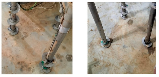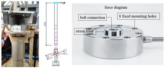 As shown in Figure 7 below, the sensor used for axial force is a spoke type sensor, with a sensor range of ±500 kg, a tension sensor. The sensor and the pile top flange are fixed by bolts, and then the sensor is connected to the force transmission frame on the conduit frame through the screw and nut. The hole through the screw on the force transmission frame is much larger than the diameter of the screw. The axial force is applied to the sensor through the screw.