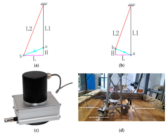 Displacement sensor and its arrangement. (a) Geometry of pile displacement under pressure; (b) Geometry of pile displacement under tension; (c) Pull-wire displacement meter; (d) Displacement sensor connection and arrangement.