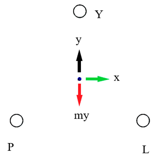 An exploratory study was conducted to investigate the bearing capacity of a three-pile guide frame foundation under shallow burial conditions at a depth of 4 times the diameter of the bottom blade (referred to as “D50”) and under deep burial conditions at a depth of 6.5 times the diameter of the bottom blade (referred to as “D75”). The loading directions were divided into three scenarios: x, y, and my, as depicted in Figure 10. These were represented as d-x, d-y, and d-my, respectively: d-x denotes the compressive load on the L-pile and tensile load on the P-pile under lateral resistance, d-y indicates the compressive load on the Y-pile and tensile loads on both the P-pile and L-pile, and d-my represents the tensile load on the Y-pile, with compressive loads on the P-pile and L-pile.