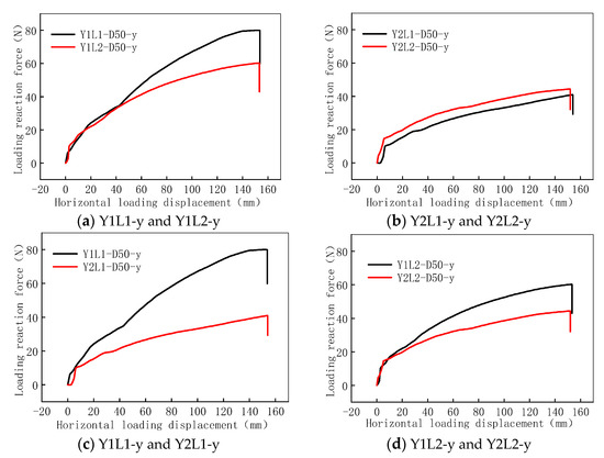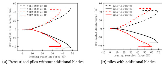 In both (a) and (b) of Figure 21, it is observed that adding blades leads to a decrease in tension pile soil pressure. Although larger tension pile displacements would typically yield higher soil pressures at the blade interface, horizontal displacement should also be considered. To this end, Figure 22 portrays the development of horizontal displacement with applied load at the respective models depicted in Figure 21. Clearly, for the same load, when blades are added to the L pile (compression pile), the horizontal pile displacement increases. This results in greater disturbance to the soil, weakening its strength. Additionally, the increased angle of the pile, influenced by blade interaction with the soil, diminishes the axial impact of the blades, leading to reduced soil pressure and exacerbating the foundation’s bearing capacity disparity. The reason for increased horizontal displacement is also evident. The foundation’s point of loading necessitates both axial and horizontal displacement, with the former originating from the pile’s axial and horizontal movements, and the latter from the pile’s top bending. Notably, bending in the pile is negligible in the model experiment. As compression pile axial stiffness increases, horizontal displacement also increases. It is evident that mutual influence and constraint manifest in horizontal displacement as well.