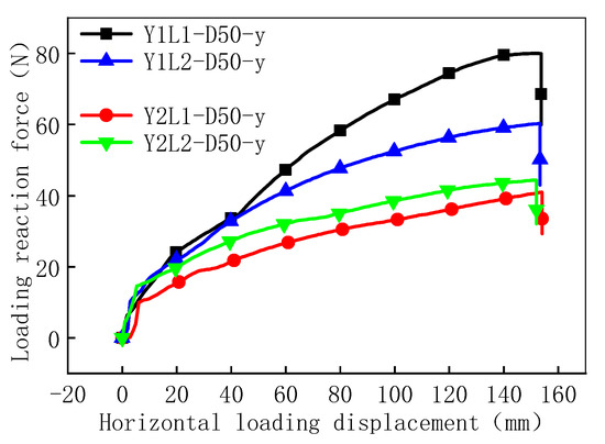 The displacement load data are measured by the loading device, which is a horizontally loaded electric cylinder, as shown in Figure 5 above. The force is collected by the spoke type pulling pressure sensor at the contact end of the electric cylinder, and the loaded reaction force and displacement information is automatically captured and recorded by the control operating system of the electric cylinder.