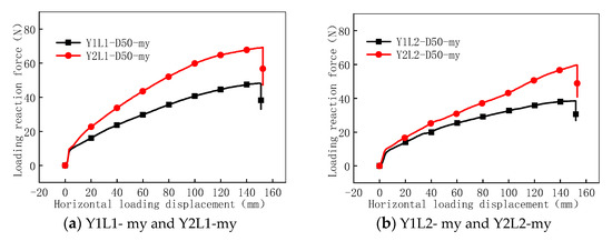 Building on the preceding analysis, considering the tension load on a single pile in the d-y orientation, the relative bearing capacity between the foundation sides still exhibits variability. On the d-my orientation, where both piles experience compression, the pattern should be straightforward. As supported by Figure 14 and Figure 15, the following observations corroborate earlier analyses: (a) Figure 14a,b depict the reinforcement of tension piles, aligning conspicuously with Figure 15’s portrayal (b); (b) Figure 14a,b illustrate the enhancement of compression piles, aligning conspicuously with Figure 12c,d; (c) Figure 15c reveals an amplification in bearing capacity with an increasing number of blade elements in Y-piles. This contradicts Figure 13’s trend. Moreover, d-y orientation surpasses d-my when the blade count of Y-piles is one, the difference in bearing capacity between the two loading orientations is most pronounced; (d) Figure 15d illustrates how variations in blade elements affect the relative bearing capacity in different loading orientations. When the blade count of Y-piles is one, the bearing capacity in d-y is approximately 1.6 times that in d-my. As blade count increases to Y2L2, the gap narrows, exhibiting changes in relative size throughout the loading process. Notably, except for the initial phase, the curves for Y2L1 and Y2L2 both show a descending tendency during most of the process, indicating differences in the development of bearing capacity between compression and tension single piles.
