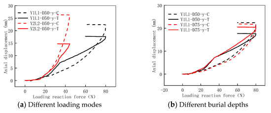 Illustrated in Figure 16 is the axial displacement behavior of the foundation with uniform blade distribution. Here, C signifies compression pile and T denotes tension pile. From panel (a), the mode of displacement failure echoes the deep embedding scenario, manifesting as rapid growth in displacement for compression piles, ultimately surpassing tension pile displacement. Yet, comparing the outcomes in panel (b), it is apparent that for Y1L1, the disparity in foundation displacement is more pronounced under relatively shallow embedding. Clearly, the failure of compression piles becomes more evident and direct. The reduction in embedding depth evidently diminishes the bearing capacity of compression piles, consequently reducing the relative magnitude of bearing capacity between the two sides of the foundation. For Figure 17, portraying the case of non-uniform blade distribution, similar displacement failure patterns are observed when compared with deep embedding conditions. Displacement of compression piles is smaller than that of tension piles, and the disparity accentuates in panel (b). This suggests that the increase of a blade element on a compression pile relative to deep embedding amplifies the bearing capacity gap. In shallow embedding, the bearing capacity of both tension and compression piles diminishes considerably due to reduced embedding depth. Consequently, variations in blade elements significantly alter pile bearing capacity and provoke distinct changes in relative magnitude on either side of the foundation.