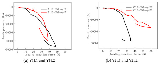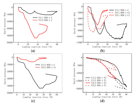 Variation of soil pressure at the blade. (a) Y1L1-C and Y1L2-C, (b) Y1L1-C, Y2L1-C2 and Y2L1-C1, (c) Y1L2-C and Y2L2-C1, (d) Y1L1- T2, Y1L2-T1, Y1L2-T1 and Y2L2-C1.