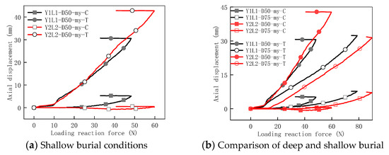 Further analysis is warranted to explore the impact of additional and distributed blades on bearing capacity and its characteristics. In Figure 12, the arrangement of diagrams follows the trend of blade addition: Figure 12a,b reflect the effects of adding blades on the tensile side. Notably, (a) and (b) yield differing results. In (a), the addition of blades has an adverse impact on foundation bearing capacity, while in (b), it has a positive effect. From Figure 12, the disparity in bearing capacity stems from differences in Y-pile configuration. Counterintuitively, a smaller number of blades on the Y-pile results in greater foundation bearing capacity. This trend in shallow burial conditions is contrary to that in deep burial conditions. Taking into account the analysis results in the previous graph, the divergence arises from the load-bearing characteristics of compression and tension piles: in shallow burial conditions, the disparity in bearing capacity between tension and compression piles is more pronounced. When Y-pile blade numbers increase, this disparity only widens, making it harder for compression piles to bear loads and further emphasizing the role of tension piles in determining bearing capacity and failure mode. The outcomes depicted in Figure 12c,d further underline the disadvantage of enhanced compression piles. As shown in Figure 13, a smaller burial depth results in a smaller burial depth of the top blade, because the gap between the bearing capacity of Y1L1-y and Y1L2-y in this study originates from the compressed piles, whereas Figure 12b belongs to the unfulfilled bearing capacity of the compressed piles, which reflects the gap in the ultimate bearing capacity of the tensioned piles.
