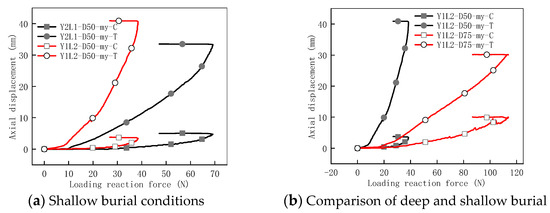 Figure 19 delves further into the foundation’s bearing characteristics in terms of axial displacement. As depicted in (a), when under shallow embedding conditions, the addition of spiral blades on d-my leads to a reduction in displacement for the compression pile and an increase in displacement for the tension pile, thereby widening the gap between them. Similarly, as seen in (b), when compared to deep embedding, both Y1L1 and Y2L2 compression pile displacements diminish, and the disparity between tension and compression pile displacements increases. Both (a) and (b) underscore that under shallow embedding, tension piles exhibit a reduced relative bearing capacity compared to compression piles, accentuating the foundation’s shortcoming. As earlier elucidated, mutual interaction and constraint exist between compressed and tension piles in the foundation. The efficacy of the compression pile’s bearing capacity hinges on the tensile pile’s bearing capacity and restraint, necessitating that the tensile pile possess sufficient load-bearing capacity. However, it is evident that shallow embedding exacerbates the unfavorable situation for the tension loading of individual piles.