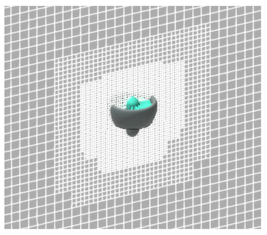where ; denotes the transformation matrix; represents the relaxation factor; and and represent the momentum and equilibrium momentum, respectively. In the LBM, forces in the governing equations necessitate the utilization of a dedicated force model. This model is typically represented as DnQm, where and represent the dimension of the flow and the directions of discrete velocity, respectively. In this study, the LBM based on the D3Q27 lattice model with a central-moment collision operator was employed (see Figure 3) [31,32]. This choice of solver offers improved numerical stability when compared to the standard LBM approach. An octree structure was utilized to accommodate non-uniform lattice structures, allowing for the incorporation of varying spatial scales at different locations within the calculation domain [33]. A volume-based approach was employed, wherein it is assumed that the distribution functions are positioned at the gravity centre of the lattice. The initial octree lattice structure was generated by considering the lattice resolution specified by the input geometry and the far-field resolution. Any region can be refined at the designated lattice resolution (see Figure 4). The ratio of the size of the grid element and the time step can be consistently maintained across the entirety of the calculation domain, enabling each lattice within the calculation domain to always employ adaptive time steps [34].