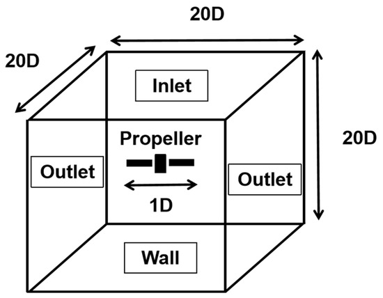 This paper presents the results of numerical simulations conducted under two different conditions: an unobstructed environment and hovering above the water surface. The propeller speed was set at 11,400 r/min. The non-dimensional heights, h/D, for the water-hovering condition were set as 0.67, 1.33, 2.0, 2.67, and 3.33, where h is the distance between the propeller and the water surface and D is the diameter of the propeller. The discussion about the experimental and simulation results is provided in the subsequent sections. In Figure 5, the numerical domain of the ducted propeller in hover is depicted. The boundary conditions of the outlets (with uniform pressure) are imposed on all side faces, while the inlet velocity condition is applied to the top face. The wall is situated at the bottom face. Except for the wall, all boundary conditions were simulated using a damping layer with a thickness of D/4. This layer gradually increases in viscosity to prevent the reflection and damping of pressure waves prior to reaching the boundary, as outlined in reference [37]. The distance between the ducted propeller and the water surface was determined by setting the initial position of the gas–liquid interface.