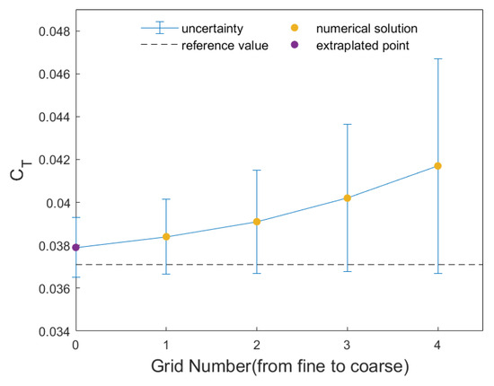 In the study of the discretization, uncertainty estimates using numerical solutions and grid nodes were generated at varying resolutions of 0.005 m, 0.0025 m, 0.00125 m, and 0.000625 m, respectively. The simulation duration was defined as 10 s, with a time interval of s. The calculation results satisfy the monotonic convergence condition, as demonstrated in Table 2. This makes it possible to conduct grid convergence research based on the grid convergence index (GCI) proposed by Roache [38] and provides an error band for the numerical solutions. The changes in the numerical solutions of the thrust coefficients for the four sets of grids are shown in Figure 6. The discrete uncertainty was calculated and is presented as an error band. An estimated value of the coefficient was obtained by using the result of the 4th resolution based on Richardson extrapolation, which corresponds to the value at the abscissa of 0 in Figure 6. The thrust coefficient was estimated to be 0.0379, with an error band of 4.04%. These results indicate that the solutions are well within the range of convergence. Considering the need for precise and efficient computation, the resolution of the near-wall grid was set to 0.00125 m. The calculation results were recorded at regular intervals of 100 steps per second, guaranteeing an ample amount of data for subsequent analysis.