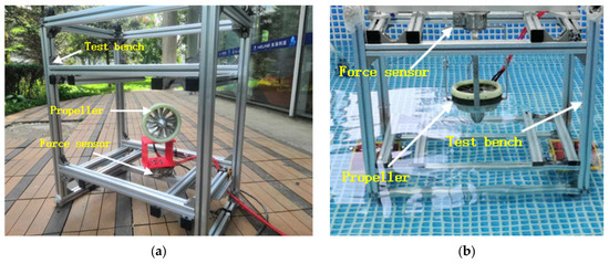 The experimental configuration for the ducted propeller in an unobstructed environment is illustrated in Figure 7a. In this setup, the propeller is driven by a brushless DC motor, which is positioned inside the hub fairing. The ducted propeller is fixed to the bench with a force and a torque sensor, and the direction of the thrust is horizontal. The sensor is responsible for measuring the thrust produced by the entire ducted propeller system. The force and torque sensor were designed by ATI company, with a resolution of 1/20 N and 1/800 Nm, respectively. The sensing range is 130 N for the X- and Y-direction forces, 400 N for the Z-direction force, and 10 Nm for torque. The maximum frequency of the sensor is 7 kHz. The experimental setup utilized in this study is characterized by its simplicity, and setting the propeller axis horizontally effectively mitigates the impact of ground effect on lift production, resulting in more accurate results. The experimental configuration employed to test the propeller hovering near a water surface resembles the setup utilized for unobstructed environment testing, with the sole modification being the substitution of the bracket to orient the axis of the propeller in a vertical position (see Figure 7b). The test bench was placed in water to test in conditions where the propeller was hovering above a water surface.